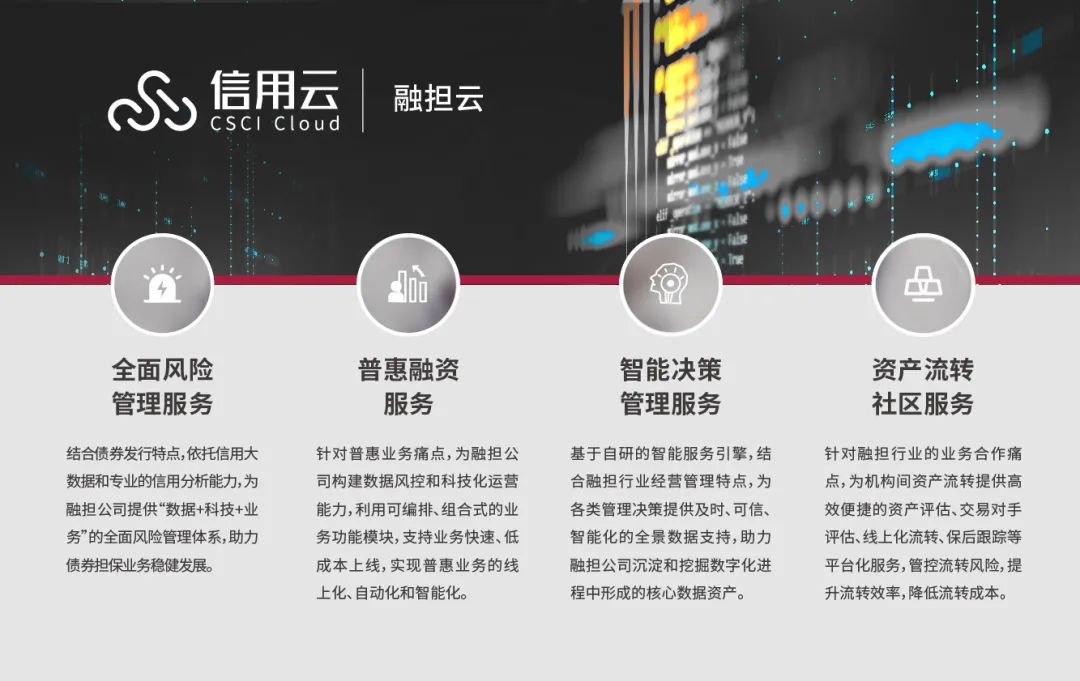 “融担云”是中证信用基于信用科技综合服务云平台“CSCI Cloud信用云”对融担行业推出的体系化解决方案,旨在全面提升融担机构的核心能力,推动业务健康可持续发展。